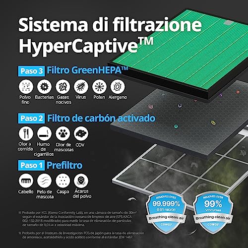 Como alguien que tiene sensibilidad a los alérgenos, puedo decir que el Coway Airmega 150 ha superado mis expectativas en este aspecto. Este dispositivo está diseñado con una combinación de un prefiltro, un filtro de desodorización y un filtro GreenHEPA, que eliminan el impresionante 99,999% de las partículas de tamaño nanométrico de hasta 0,01 micras. Esto incluye polen, polvo, humo y otros alérgenos.